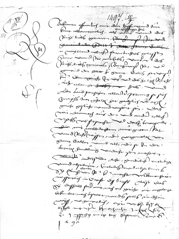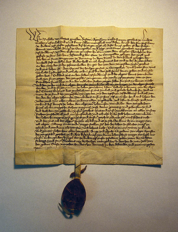 This document from the early 1400's concerns Hans Varnbüler. It was originally folded and sealed with the wax seal seen hanging below it.