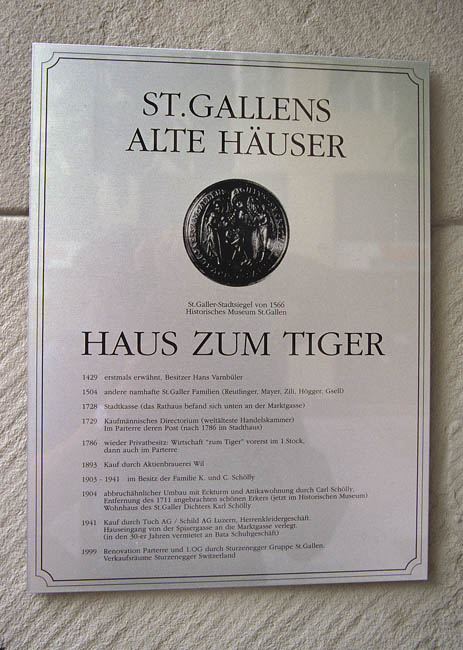 This wall plaque in the historical old center of St. Gallen (near the intersection of Marktgasse and Speisergasse) shows Hans Varnbüler as the first recorded owner of the house known as the Haus zum Tiger. (Houses then did not have numbers, but had names instead). (Scroll down for a close-up photo below).